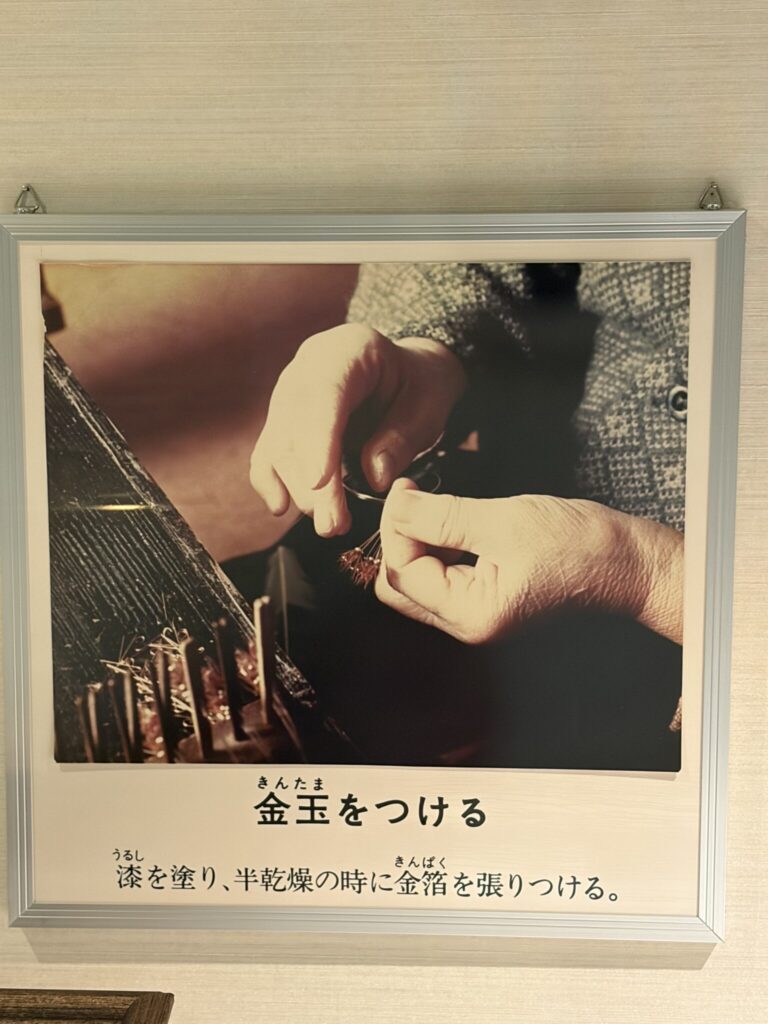 虫に似せるための金色の目玉を取り付ける工程なのです